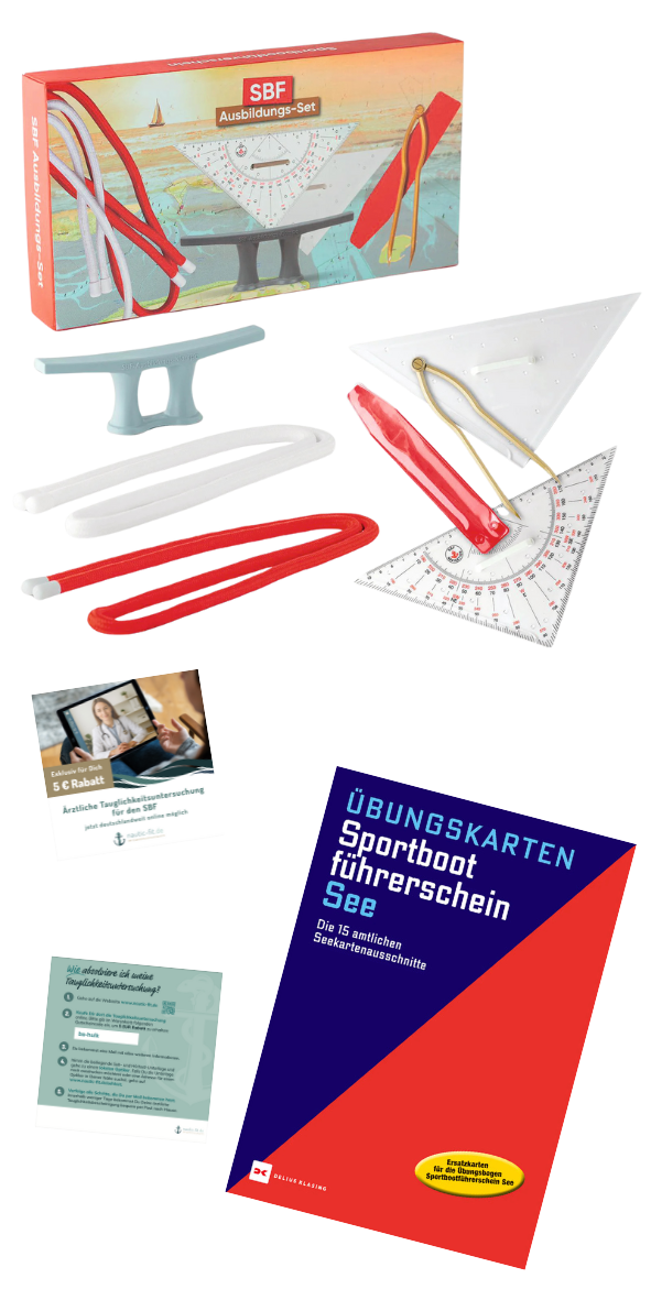 Zwei Übungsleinen (je ca. 90 cm, unterschiedliche Stärke), eine hochwertige Ausbildungsklampe (16 cm lang) und passende Klebepads – damit sitzen die wichtigsten Knoten im Schlaf.15 offizielle Übungskartenausschnitte SBF See: